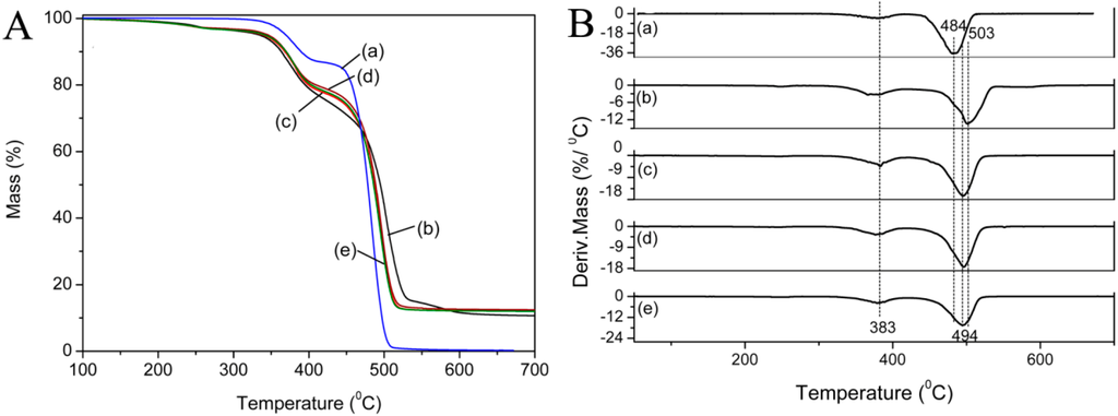 A: TGA and B: DTG curves for ethylene vinyl acetate (EVA) and composites. (a) EVA; (b) S–NiMgAl–Mn/EVA; (c) S–NiMgAl–Co/EVA; (d) S–NiMgAl–Cu/EVA and (e) S–NiMgAl–Zn/EVA.