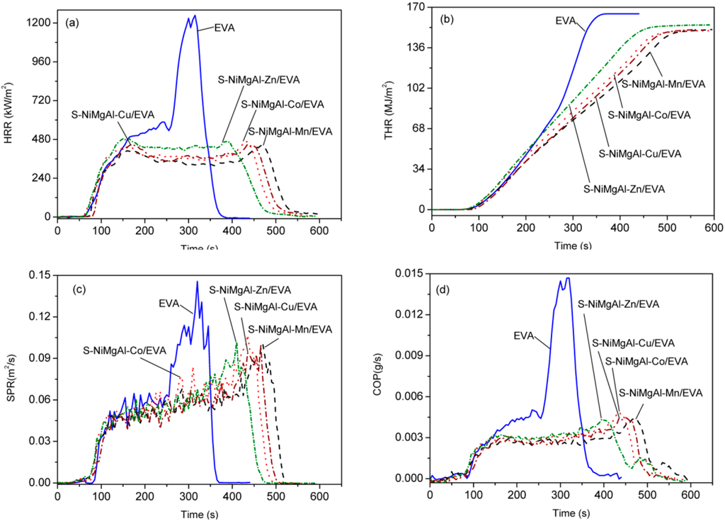 Cone calorimeter test is used to predict the combustion behavior of materials in real fire scenarios [44]. Figure 7a–d present the heat release rate (HRR), the total heat release (THR), the smoke production rate (SPR) and the production rate of CO (COP) curves of the pure EVA and its composites, respectively. Table 1 lists the corresponding combustion data. From Table 1 and Figure 7a, it can be seen that the peak heat release rate (pk-HRR) of EVA, S–NiMgAl–Mn/EVA, S–NiMgAl–Co/EVA, S–NiMgAl–Cu/EVA and S–NiMgAl–Zn/EVA are 1247, 445, 467, 451 and 485 kW/m2, respectively. The reductions in pk–HRR for all of the composites are 61% greater than that of EVA. In addition, the pk-HRR time for EVA, S–NiMgAl–Mn/EVA, S–NiMgAl–Co/EVA, S–NiMgAl–Cu/EVA and S–NiMgAl–Zn/EVA are 315, 466, 429, 170 and 149 s, respectively. S–NiMgAl–Mn/EVA shows the lowest pk-HRR and the longest pk-HRR time among all samples. At the same time, compared with the ignition time (Tign) of the EVA of 62 s, the Tign of S–NiMgAl–Mn/EVA, S–NiMgAl–Cu/EVA and S–NiMgAl–Zn/EVA are postponed to 74, 82 and 66 s, respectively. In contrast, Tign of S–NiMgAl–Co/EVA was shortened to 58 s. Therefore, S–NiMgAl–Cu/EVA is the most difficult material to burn for longer Tign. The fire performance index (FPI) is another important fire resistance parameter. FPI is defined as the ratio of pk–HRR to Tign. The FPI values of S–NiMgAl–Mn/EVA, S–NiMgAl–Co/EVA, S–NiMgAl–Cu/EVA and S–NiMgAl–Zn/EVA are 6, 8, 6 and 7 kW/m2s, respectively. These values are much smaller than that of the EVA (20 kW/m2s), confirming that S–NiMgAl–Mn/EVA and S–NiMgAl–Cu/EVA have better flame retardant efficiency. In addition, the THR values for all the composites are slightly decreased compared with that of the EVA.