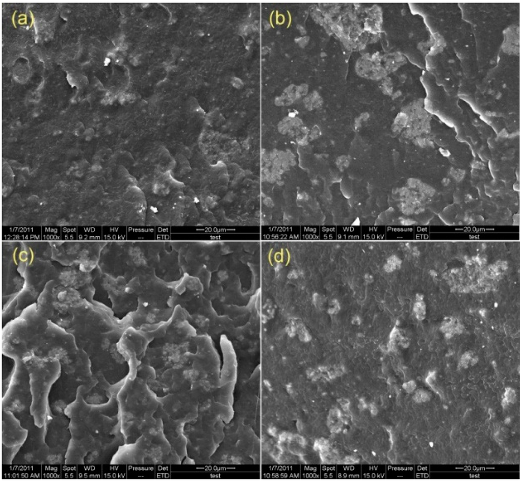 SEM images (1000×) of fractured surfaces for all the composites with 20 wt. % LDH. (a) S–NiMgAl–Mn/EVA; (b) S–NiMgAl–Co/EVA; (c) S–NiMgAl–Cu/EVA and (d) S–NiMgAl–Zn/EVA.