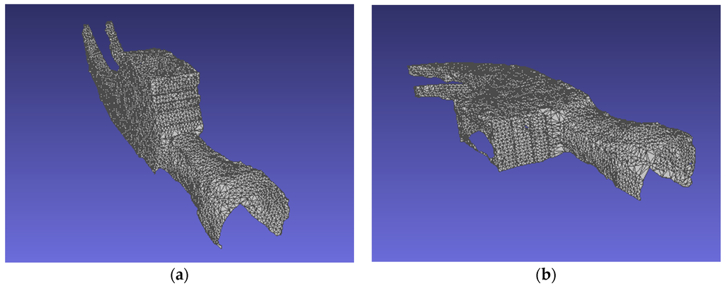 Illustration of two series of scans with missing parts of object surfaces. (a) Triangle mesh of series of scans 1; (b) Triangle mesh of series of scans 2.