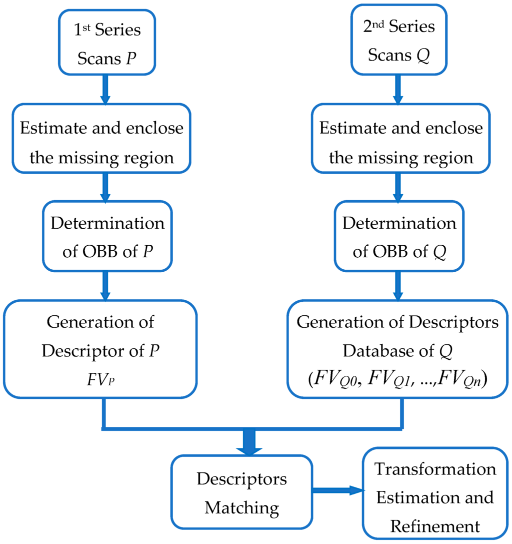 To make the proposed method clear in its operation procedure, the following flow chart diagram, shown in Figure 3, as well as Algorithm 1, is used to describe the proposed method in its main five steps. In step 1, the boundary points located near the scanning point missing zone can be detected through the geometric relationship with the support plane, using a set of connected edges that satisfy two conditions, in which all the boundary edges in the point missing zone have a similar orientation and each edge lacks an assigned triangle, either on the left or on the right side []. Then, the oriented bounding box (OBB), which is a rectangular bounding box that covers all the object point cloud, is determined in step 2. In the next step, the generation of the descriptors of the point cloud is performed. Then, the matching process between the descriptors is implemented and achieves the initial transformation that can be used for further refined registration using ICP.