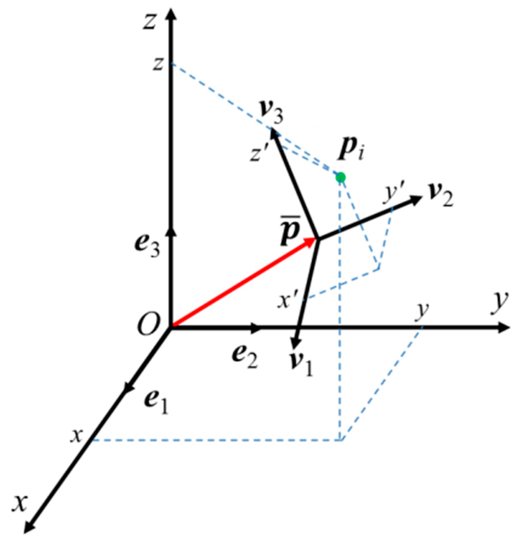 The above matrix has three real eigenvalues, λ1 ≥ λ2 ≥ λ3, and three normalized eigenvectors, v1(v11, v12, v13), v2(v21, v22, v23), and v3(v31, v32, v33), respectively. These eigenvectors are considered as the three directions of the OBB. By projecting all points in the object point cloud onto the eigenvectors, three dimensions of the object can be determined as the distance between the nearest and farthest projected points in each eigenvector. Considering the coordinate system with the origin and three unit vectors v1, v2, and v3 (as shown in Figure 6), the coordinates of the point pi(xi, yi, zi) in this coordinate system are determined by following equation: