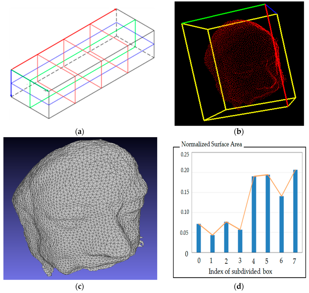 Each proposed feature descriptor includes two components []. The first component contains the information about the OBB of the point cloud. Each OBB is represented by a corner, C(xC, yC, zC), and three vectors, CC1(xmax, ymax, zmax), CC2(xmid, ymid, zmid), CC3(xmin, ymin, zmin), corresponding with the maximum, middle, and minimum dimensions of the OBB, respectively. The second component represents the distribution of the surface area of the object in the OBB. We assume that the three directions of the OBB are divided into k1, k2, and k3 segments (as shown in Figure 7a); the total number of subdivided boxes in the OBB is n = k1 × k2 × k3. The surface area of the object in each subdivided box Vijk (i = 0, ..., k1 − 1; j = 0, ..., k2 − 1; k = 0, ..., k3 − 1) is denoted as fv, where v = k(k1k2) + j(k1) + I; fv can be determined by subdividing the considered surface into the triangle mesh [] (as shown in Figure 7c). The distribution of Sv is defined as the regional area-based descriptor, shown in Figure 7d. Thus, the feature descriptor FV can be described as follows: