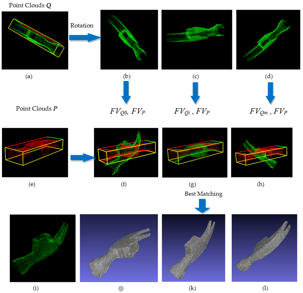 The coarse registration process between series of scans point cloud P and series of scans point cloud Q: (a) hammer point cloud Q from the first series of scans; (b–d) rotation of point cloud Q; (e) hammer point cloud P from the second series of scans; (f–h) the OBB regional area-based descriptor of P and Q; (i) overlap rejected model after refine registration; (j–l) the triangle meshes of the hammer head.