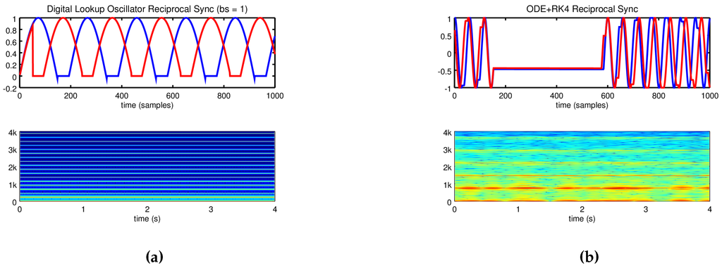 Figure 5a and Figure 5b compare reciprocal FM implemented as ODEs and as lookup oscillators. As the plots show, delay (in this case 0.0208 ms which is 1 sample at 48 kHz) between the lookup oscillators in a reciprocal FM network creates inharmonic distortion that is similar to broadband noise at higher modulation indices. On the contrary the ODE + RK4 implementation produces very different results. Broadband noise does not appear, and in the harmonic case, a low frequency periodicity emerges.