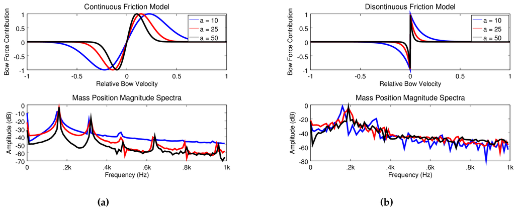 The physics of bow-string interaction is well understood [27,28,29]. The effect of the bow on the point of bowing is usually modeled through a nonlinear function which is coupled to the point of bowing (here given as a single oscillator). The motion of this oscillator is