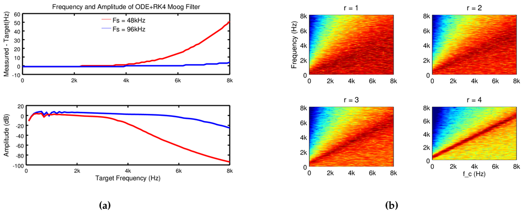 As an example of a musically interesting application of ODES and RK4 in audio synthesis that is not based on harmonic motion, we return to the ‘ladder filter’ invented by Robert Moog in 1965 [30]. This filter has been subject to numerous studies since [1]. Most digitizations use the bilinear transform [31] or some similar procedure [32] to discretize the linear portion (small signal response) of the analog transfer function. As mentioned above, since there is feedback in the circuit, digitizations of this filter often include unit sample feedback (). Again, this is problematic because the delay couples the gain parameter g (which controls the cutoff frequency of the filter) to the resonance parameter r (which controls the bandwidth of the filter). This causes additional phase shifting so that effect of the resonance parameter varies with frequency and vice versa. Many adjustments have been suggested to ameliorate this artifact of digitization [33] or to avoid the addition of delay to the feedback part of the filter without resorting to iteration. Examples of this include solution through the use of Volterra series [34,35] and linear compensation filters [36].