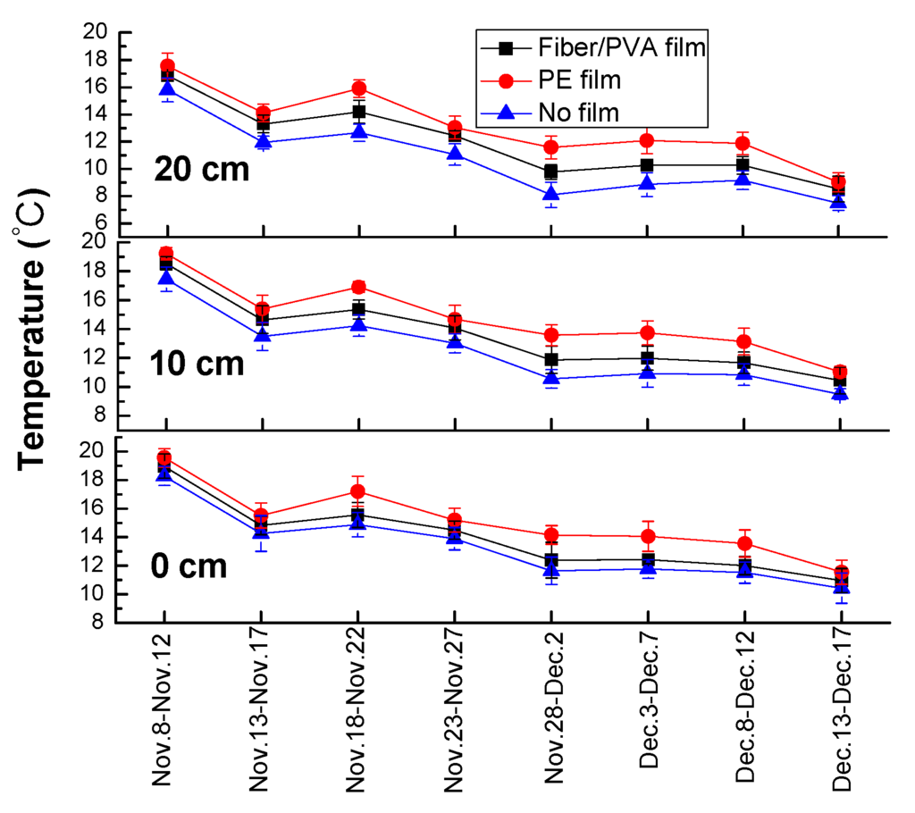Heat preservation was investigated by performing a field test that involved the cultivation of Chinese cabbage in the garden of Wangcheng District, Changsha, China (latitude: 28°18′ N, longitude: 112°51′ E, altitude: 50 m). The soil temperature was recorded by a soil temperature recorder (model TZS-6W-G, Zhejiang Top Instrument Co., Ltd., Hangzhou, China). The heat preservation behavior of the three fiber/polymer films was similar; therefore, only the results from the fiber/PVA film have been reported. The films were laid on the field, and the temperature at the position of 0 cm, 10 cm, and 20 cm under the soil surface was recorded with no film as a control using the reported method by Moreno [22]. The test was carried out over a period of 39 days from November 8, 2014 to December 17, 2014.