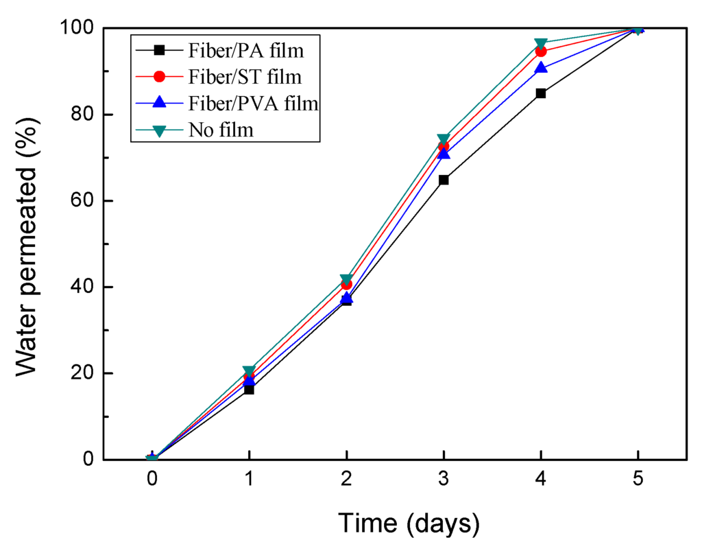 The water permeability of the three fiber/polymer films was measured under constant conditions of 25 °C and 60% RH. The results shown in Figure 2 reveal that the water permeability of different treatments decreased in the following order: no film > fiber/ST > fiber/PVA > fiber/PA. It can be inferred that this arrangement is in line with the hydroscopicity of the films and, indirectly, is in accordance with the hydrophilic ability of polymers. Both fiber/polymer films allowed water to easily permeate into the soil and maintain the moisture content of the soil, which had a better water holding capacity than PE film.