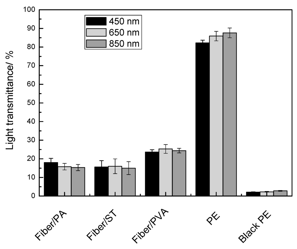 The determination of photopermeability can provide the data of the extent to which the white fiber/polymer films can prohibit the light. Figure 3 shows that the light transmittance of the three white fiber/polymer films is below 25%, much lower than that of the PE film; the black PE film had alight transmittance below 3%. Therefore, the fiber/polymer films were able to prohibit the growth of weeds by reducing the transmitted light to some extent. Some natural dyes, such as carbon black, tannin, and humic substances, can be blended with the films to produce different colors.