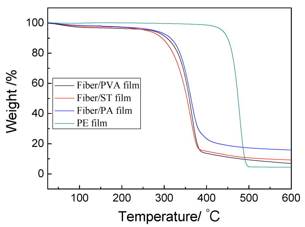 The TGA curves in Figure 4 show that weight loss began to occur for the three fiber/polymer films at approximately 300 °C, indicating that their thermal stability was poorer than that of the PE film; however, they were sufficiently stable for use as a mulching film at temperatures occurring in the natural environment.