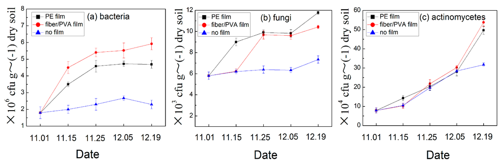 The three fiber/polymer films behaved similarly in the micro-organic culture test through our primary experiments; therefore, only the results from the fiber/PVA film had been reported. The soil microbial quantities are presented in Figure 5 and show that the amount of microbes increased over time. The bacteria and actinomycetes were richest using fiber/polymer films, and the fungi was richest using the PE film. The covering of films can produce more microbial, which can be caused by the degradation of the film or heat generated beneath the films; thus, the increase in bacteria and actinomycetes might be beneficial for the degradation of this fiber/polymer film.