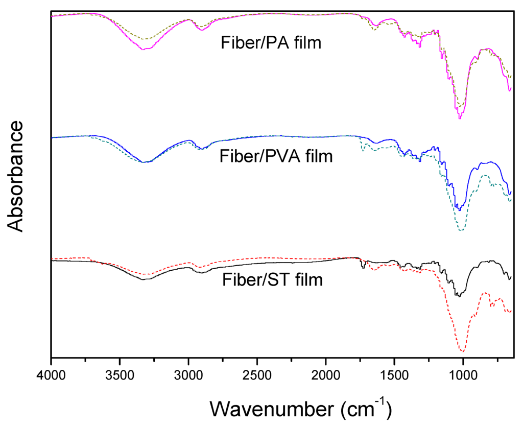 In the soil burial test, the three films were degraded for four weeks. The samples were characterized by FT-IR before and after degradation to identify the changes in spectra intensities in the films’ functional groups [23]. The results are shown in Figure 6. Before degradation, the fiber/PVA film showed characteristic absorption bands at 3331 cm−1 (O–H stretching), 2902 cm−1 (C–H stretching), 1628 cm−1 (C–O stretching), and 1316 cm−1 (–CH2 bending). In addition, the absorption bands at 1159 cm−1 (anti-symmetric stretching of the C–O–C bridge) and 1028 cm−1 (skeletal vibrations involving C–O stretching) were characteristic of a saccharide structure. The IR spectra for the fiber/ST film and the fiber/PA film were similar to that of the fiber/PVA film, although the fiber/PA film had a characteristic absorption band at 1727 cm−1 (C=O stretching). Figure 6 shows major differences of absorption intensity in spectra for both the fiber/PVA and fiber/starch films before and after degradation, whereas the fiber/PA film spectra show little variance before and after degradation. The IR spectra indicates that the contents of the samples changed with the absorption intensity, also changing some characteristic peaks. These findings also indicate that the fiber/PVA and fiber/starch films degraded rapidly during this period, while the fiber/PA film degraded more slowly by contrast.