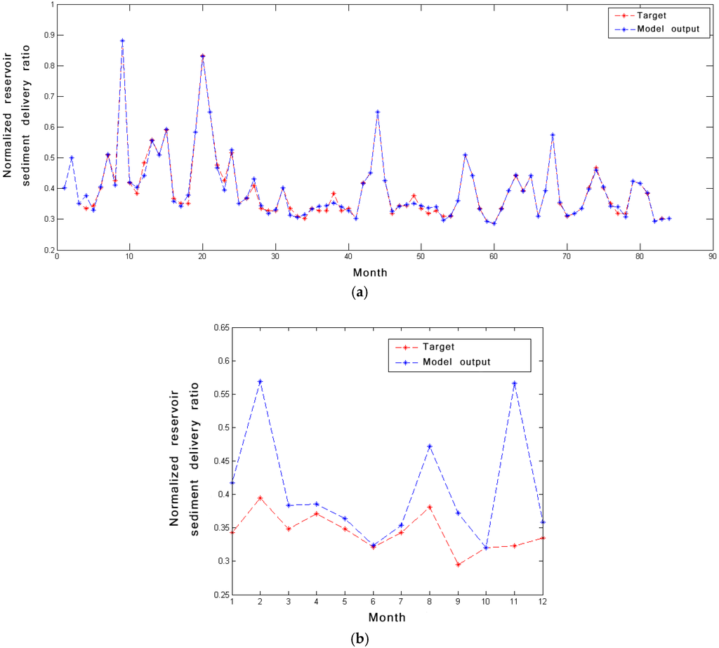 It can be seen from Figure 4 that the trained BP-ANN model can simulate the reservoir sediment flushing process with a high accuracy. When it comes to prediction, the BP-ANN model is able to reflect the relational characteristics of the reservoir sediment flushing. However, since the TGR has only been in operation for about 10 years, and the monthly data is available from 2003 to 2011, the samples used to train the BP-ANN are quite limited, and some deviations still exist. In addition, the sediment delivery from reservoir is an extremely complex process relevant to multiple influencing factors. The reservoir sediment flushing model itself is approximate with many empirical parameters. The four factors selected in this study are necessary and dominated but not sufficient. Last but not least, the majority of the sediment flows into the reservoir in flood season, and very little sediment comes in non-flood season. The difference between the sediment inflow can be several orders of magnitude in different seasons. The observed errors of sediment in the non-flood season itself is not as small as that in flood season. Synthesizing all the reasons above, the BP-ANN model established in this study is believed to be able to characterize the relationship between reservoir flushing sediment and its major influencing factors, especially in flood season, when most of the sediment comes.