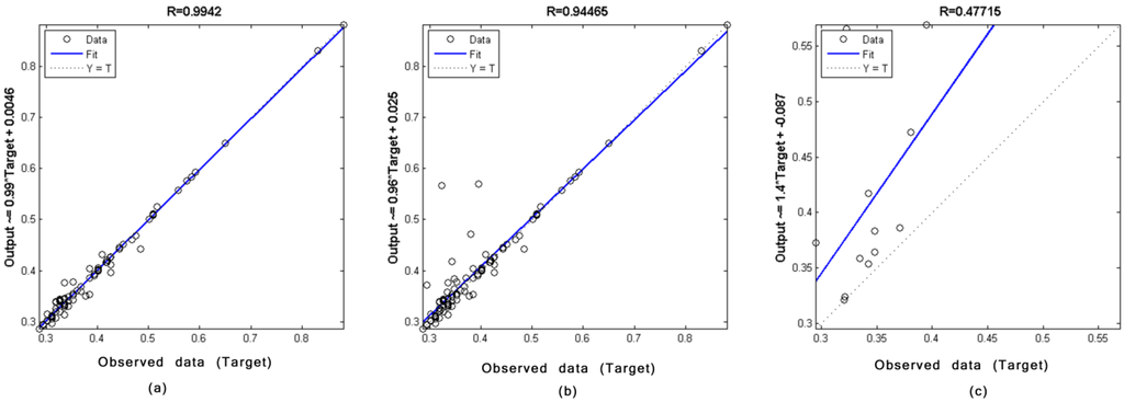 Goodness of fit between the output of the BP-ANN model and the target using (a) trained data from 2003 to 2010; (b) all the data from 2003 to 2011; and (c) tested data of the year 2011.