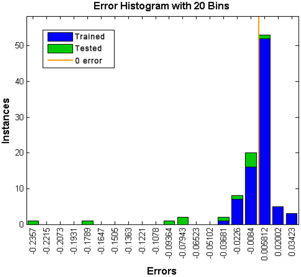 The statistics of the relative error between the model output and the actual data are shown in Figure 6. There are 96 output variables of the BP-ANN model in the training phase and 12 outputs in testing phase, as the output is monthly sediment flushing efficiency. The blue and green bars in Figure 6 indicate the number of variables with the error falling into a certain range in the training and testing phase, respectively. The red line represents 0 errors occuring. It can be seen that most of the trained outputs stick around the 0 error line. As for the tested outputs, the largest error is about 20%. However, there are only two tested outputs with the error larger than 10%, i.e., over 80% of the predicted sediment flushing efficiency is within 10% difference from the historical data.