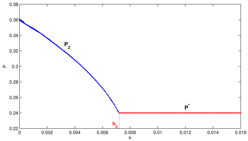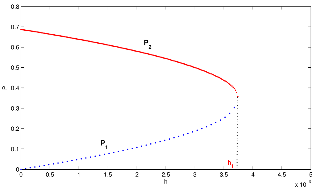 (Example 3.1. continued) The parameters values and m are the same as in Example 3.1. We obtain , , and . A forward bifurcation diagram is given in Figure 1.