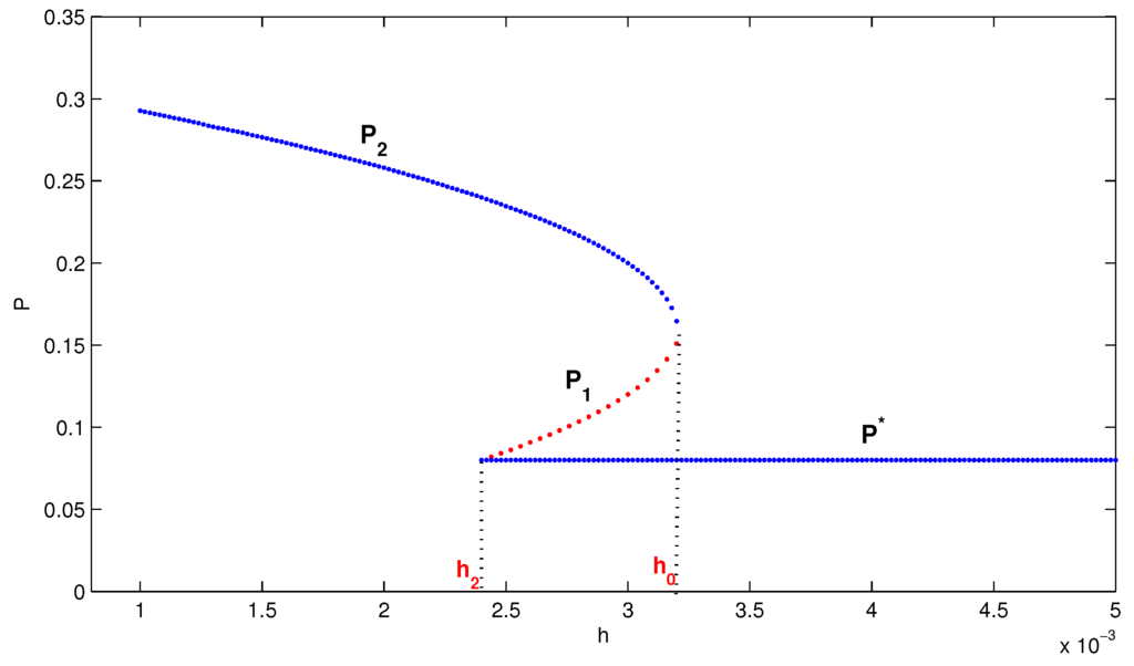 The equilibrium in Figure 4 corresponds to some point on the curve of in Figure 1 (), and the equilibrium in Figure 5 corresponds to some point on the curve of in Figure 1 ().