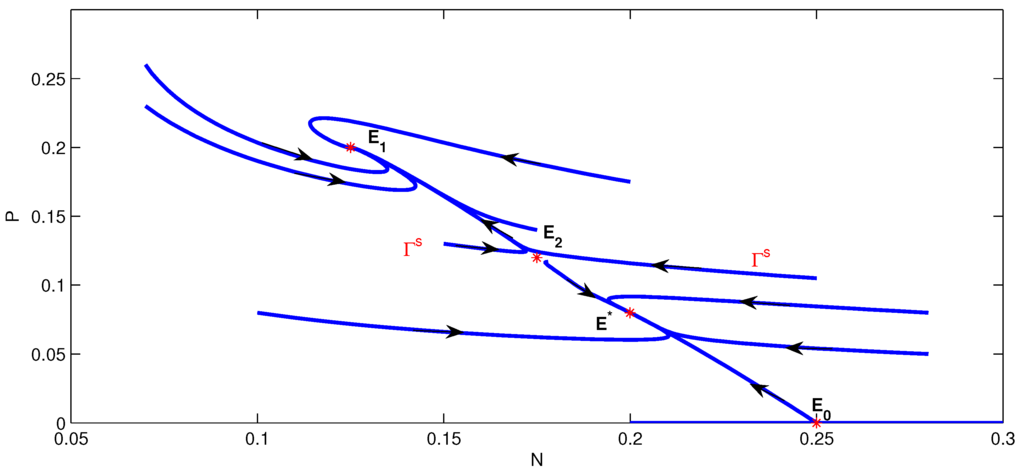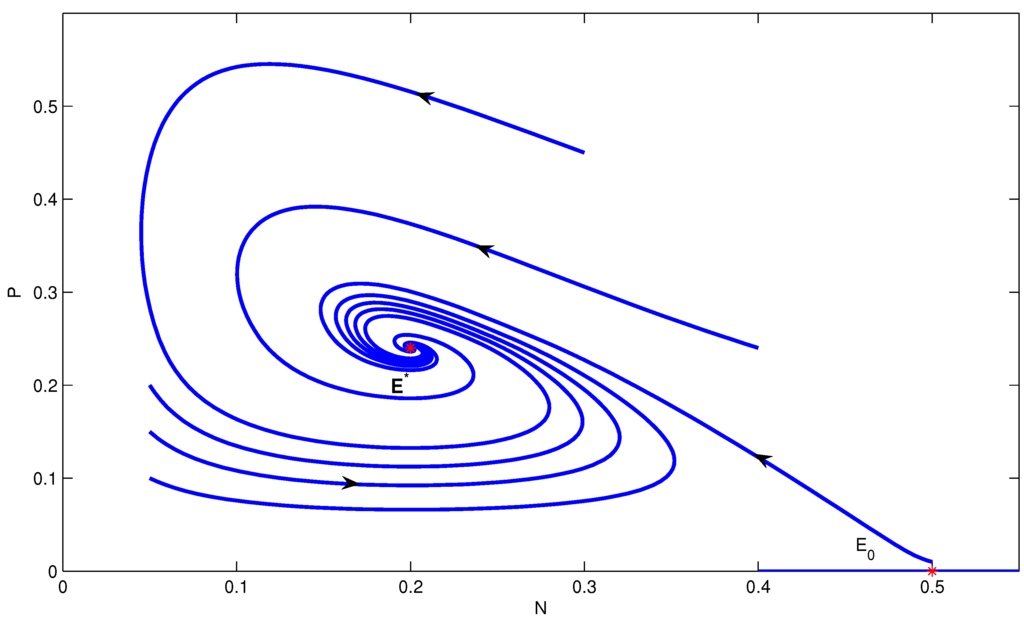 Selecting , we get . The equilibrium exists, but and do not exist (Theorem 2 ). Its phase portrait is given in Figure 4, which shows that the unique positive equilibrium is globally asymptotically stable.