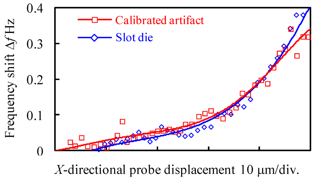 Since stb is almost the same as sts, the influence of the water layer thickness can be cancelled. Figure 4 shows the vibration frequency shifts when probing the slot die and the gauge block, respectively. The vertical axis in Figure 4 indicates the frequency shift ∆f and the horizontal axis indicates the probe displacement in the X-direction. When the frequency shift is extended to the trigger threshold, the probe position in the X-direction is measured by the laser interferometer to determine the trigger point of the probing. The probe tip is then retracted back from the measured surface immediately. As shown in Figure 4, if the frequency shift ∆f of 0.1 Hz is set to be the trigger threshold for the probing, the difference of the probe displacements for the two results in Figure 4 is less than 2 nm. Consequently, the gap width of the slot die can be measured accurately by the on-line qualification of the effective diameter of the tip ball.