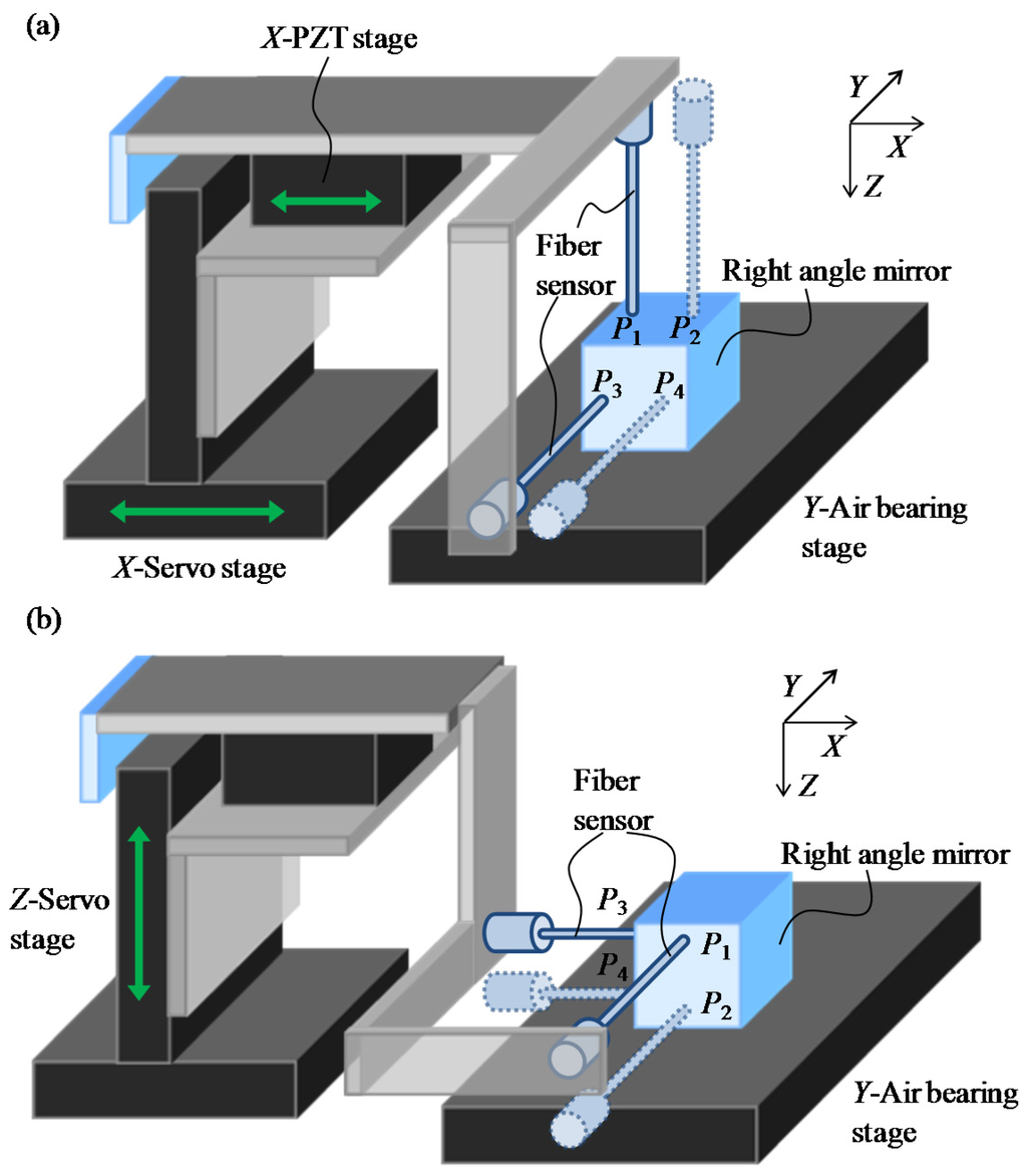 The Z-directional servo motor stage is used to adjust the measurement position inside the micro-slit along the Z-direction. The alignment errors of the Z-directional servo motor stage around the X-axis and the Y-axis are indicated as θx_Z-Servo and θy_Z-Servo, respectively. As shown in Figure 6b, θx_Z-Servo and θy_Z-Servo can be evaluated by using the right-angle prism mirror and the optical fiber displacement sensor.