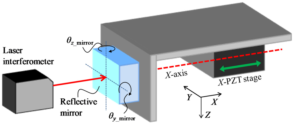 The alignment errors of the X-directional moving axis of the PZT stage around the Y-axis and the Z-axis are indicated as θy_X-PZT and θy_X-PZT, respectively. Figure 6a shows a schematic diagram of the evaluated angular alignment errors of the X-directional stages. A right-angle prism mirror is placed on the table of the Y-linear slide for measurement of the deviations in the Y- and Z-directions with the optical fiber displacement sensor. The Y-Z plane of the prism mirror is aligned in parallel with the moving axis of the Y-linear slide. Based on Equations (4) and (5), θy_X-PZT and θy_X-PZT can be calculated by moving the X-directional PZT stage. Similarly, for the X-direction servo motor stages, the alignment errors around the Y-axis and Z-axis are defined as θ_X-Servo and θz_X-Servo, respectively.