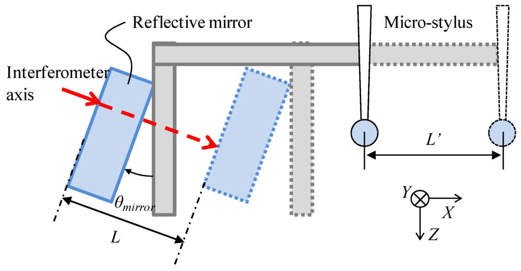 Figure 7 shows a schematic of the tilt errors of the reflective mirror with respect to the optical axis of the laser interferometer. Since the gap width of the micro-slit is obtained from the outputs of the laser interferometer, the alignment error of the laser interferometer is also an uncertainty source for the gap width measurement. When the reflective mirror of the interferometer, which is mounted on the opposite side of the micro-probe, is not perpendicular to the X-axis, a cosine error will occur, as shown in Figure 7. θy_mirror and θz_mirror are defined as the tilt errors around the Y- and Z-axes with respect to the optical axis, respectively. Figure 8 shows a schematic of the cosine error between the laser interferometer and X-directional moving axis. L is the distance measured by the laser interferometer. L' is the actual displacement of the probe tip along the X-direction. L'/L can be expressed by the following equation.