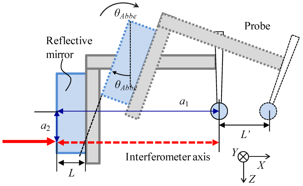 Since the gap width measurement is carried out by the probe displacement with the laser interferometer in the X-direction, the Abbe errors for the laser interferometer have to be considered for the evaluation of the combined standard uncertainty. When the center of the probe tip is not located on the optical axis of the laser interferometer, an Abbe error component will be caused in the measurement result of the probe displacement due to the tilt errors of the X-directional stages. Figure 12 shows the Abbe error between the probe tip and the laser interferometer. As shown in Figure 12, a1 indicates the X-directional distance between the probe tip and the reflective mirror. a2 is the Z-directional difference between the center of the probe tip and that of the laser spot on the reflective mirror. θAbbe is the tilt error of the X-directional stages. The Abbe errors Ly_Abbe and Lz_Abbe can be expressed as follows.