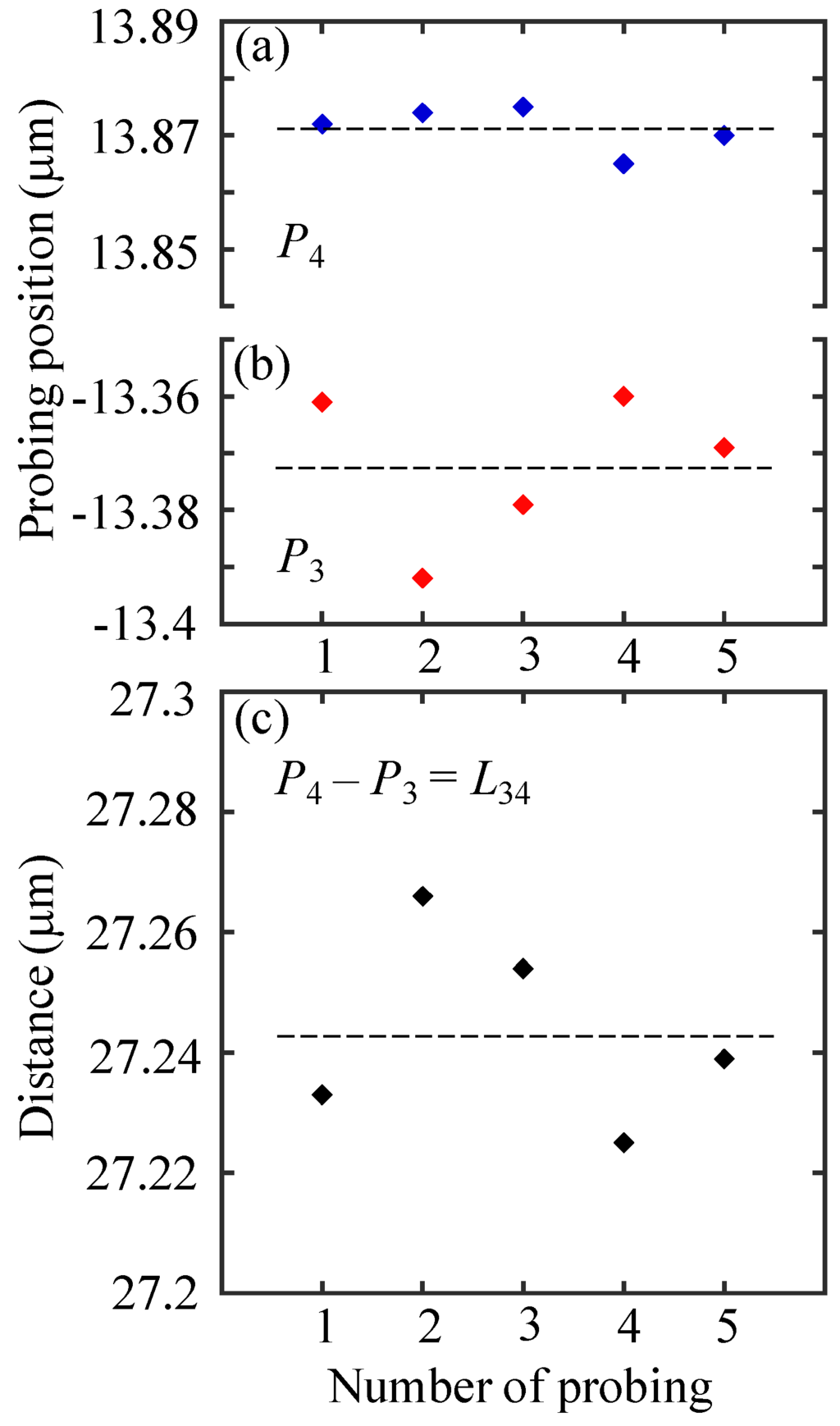Experimental results of gap width measurement: (a) Probing results at P4; (b) Probing results at P3; (c) Measurement results of L34.