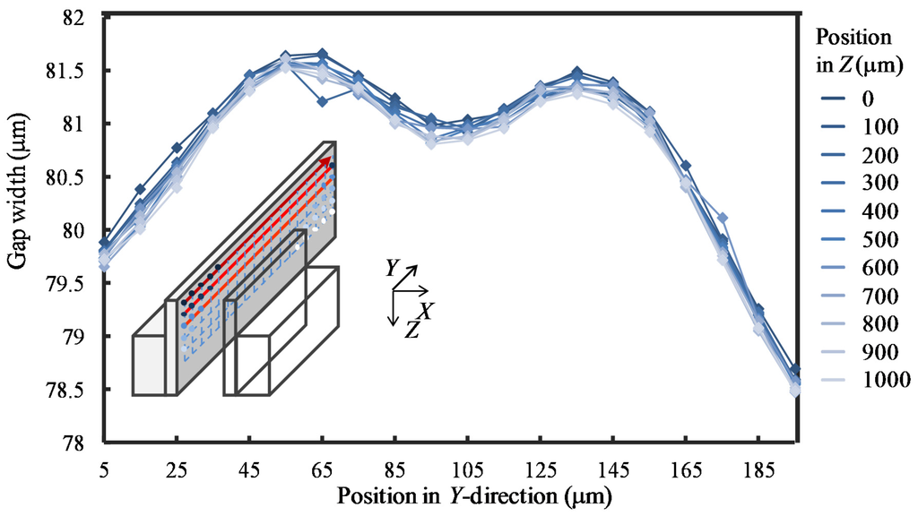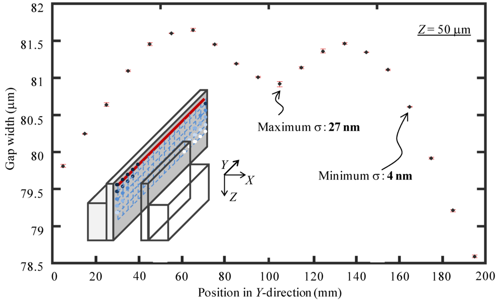 By changing the probing position along the Y- and Z-directions, the gap width uniformity was measured. Figure 16 shows the gap widths at measurement positions with an equal interval of 10 mm along the Y-direction. The measurement depth was set to be 50 μm. The probing was repeated 3 times at each measurement position. The dot plot in the figure shows the mean value of the repeated probing results and the error bar represents the corresponding standard deviation at each measurement position. The maximum and minimum values of the measured gap widths along the Y-direction were 78.883 μm and 81.980 μm, respectively. The total measurement time was approximately 1800 s. Since the two precision flat plates of the slot die were fastened by the screws at the center and the two ends of the slot die, the gap width tended to be smaller at the positions of the screws, which was corresponding to the measurement results in Figure 16. The maximum and minimum standard deviations of the measured gap widths were 27 nm and 4 nm, respectively. The employment of the long stroke air-bearing linear slide made it possible for measurement of the gap width uniformity over the entire slot die length of 200 mm, which was a significant improvement on a conventional micro-CMM.
