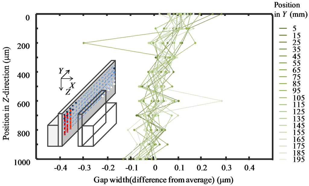 The gap widths along different Y-directional lines were measured by changing the measurement depths along the Z-direction. The interval between the measurement points along the Y-direction was 10 mm and that along the Z-direction was 100 μm. The total number of probing points was 220. During the measurement, the temperature was measured to be 24.1 ± 0.1 °C. The total measurement time was approximately 200 min. As can be seen in Figure 18, the gap widths along different Y-lines were quite similar to each other. The measured gap widths at the same Y-position but different Z-positions were employed to demonstrate the gap widths at different Z-lines. The results are shown in Figure 19. It can be seen that the gap width slightly decreased with the increase in the measurement depth for all the Z-lines.