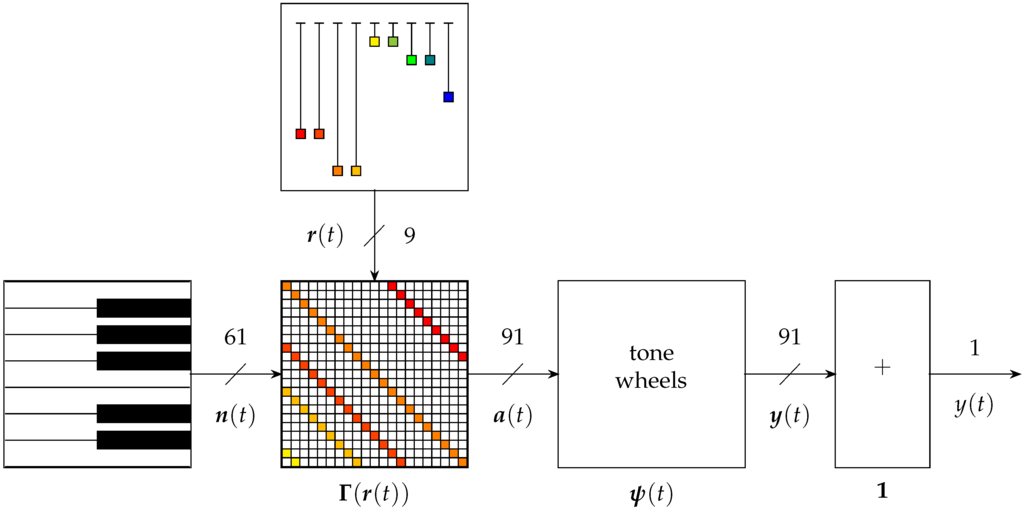 Here we extend the qualitative description above and present a mathematical formulation of the basic operation of the Hammond tonewheel organ. Referring to Figure 1, the player controls the organ by depressing keys on a standard musical keyboard shown on the left. Each of its 61 keys has a note on/off state that is indexed by a key number ; these are collected into a column . Here and in the rest of the article, t is the discrete time sample index.
