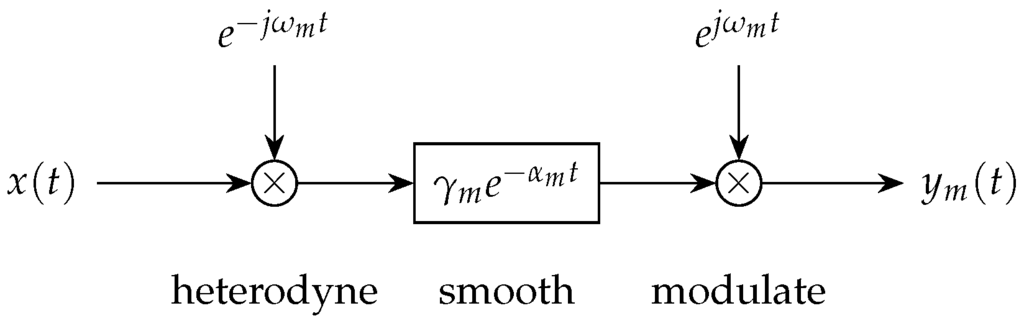 Rearranging terms in the convolution , the mode filtering is seen to heterodyne the input signal to dc to form a baseband response, smooth this baseband response by convolution with an exponential, and modulate the result back to the original mode frequency,