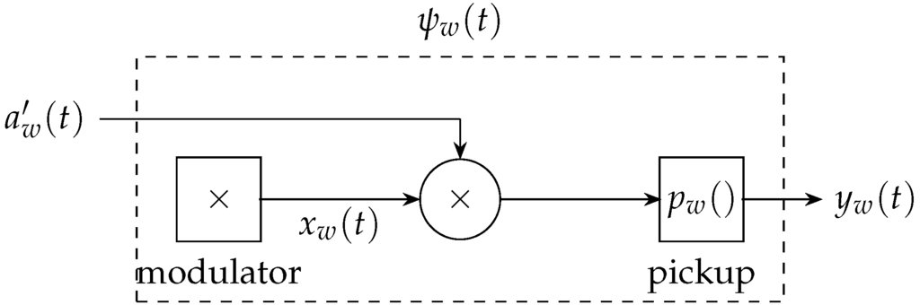 All M γs are stacked into a diagonal gain matrix Γ. All the heterodyning sinusoids are stacked into a column , and all of the modulating sinusoids into a column . The mode damping filters are stacked into a column . This process is shown in Figure 4. The heterodyning and modulation steps implement the mode frequency, and the smoothing filter generates the mode envelope, an exponential decay.