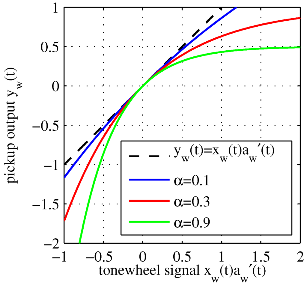 The Hammond organ is essentially an additive synthesizer. Additive synthesizers create complex musical tones by adding together sinusoidal signals of different frequencies, amplitudes, and phases [4]. In the Hammond organ, 91 sinusoidal signals are available. These sinusoids are created when “tonewheels”—ferromagnetic metal discs—spin and the pattern of ridges cut into their edges is transduced by electromagnetic pickups into electrical signals, a technique originated in Thaddeus Cahill’s late-19th century instrument, the Telharmonium [5]. Hammond organ tonewheel pickups have not been studied much in particular, but modeling and simulation of electromagnetic pickups in general is an active research area [6,7,8,9,10]. Any nonlinearities in a pickup model will cause bandwidth expansion and add to the characteristic sound of the Hammond organ. In the case that this bandwidth expansion would go beyond the Nyquist limit, alias-suppression methods become relevant [11,12,13,14].