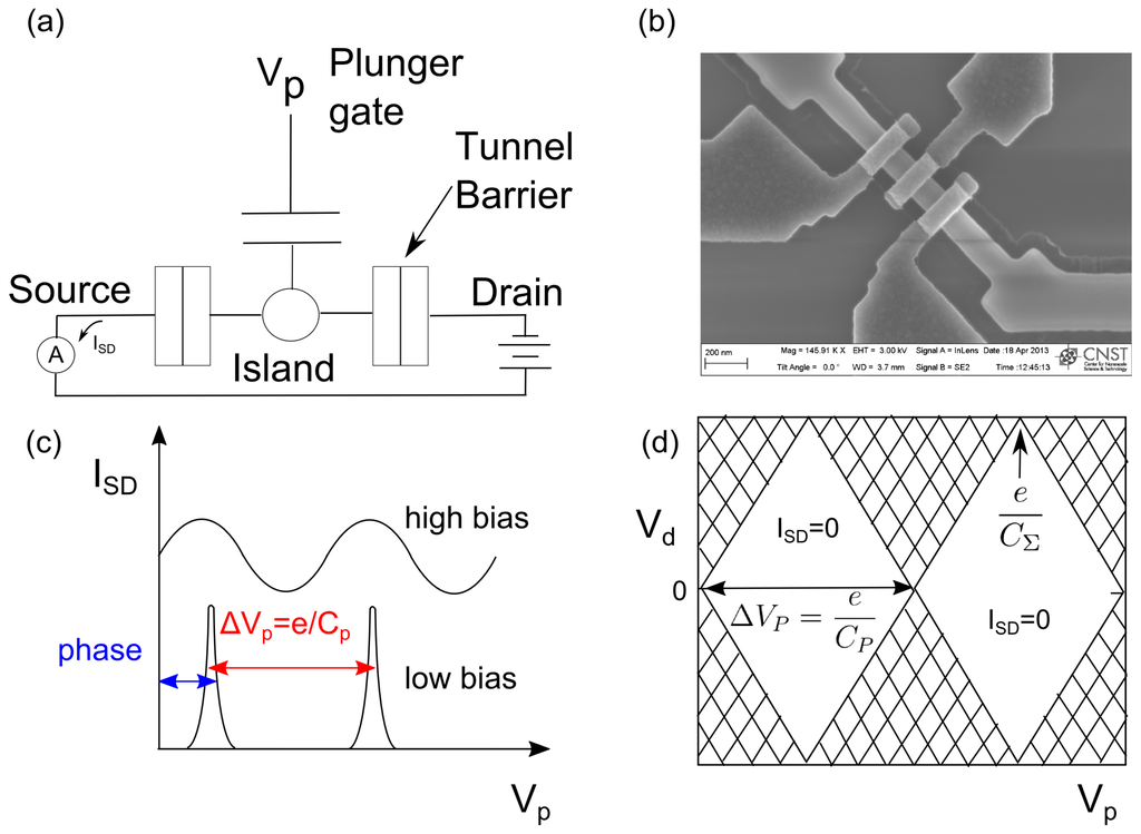 Figure 1a shows a circuit diagram representation of an SED. The tunnel barriers define an isolated island whose charge can only be changed by an integer number of electrons. As shown in the figure, the SED is a three terminal device where the gate electrode primarily controls the electrostatic potential of the island. Figure 1b shows an SEM image of one type of SED fabricated in silicon. The device consists of an etched and oxidized silicon nanowire with three finger gates wrapping around the device. These gates are used to form electrostatic tunnel barriers while an upper gate covering the wire from source to drain provides carriers (not shown). Dots are formed between the finger gates. The center finger gate can act as a barrier (to form two dots) or as a plunger gate when one dot is formed. Because the island is small, its total capacitance to the other electrodes is small. This implies a measurable electrostatic energy barrier for adding an additional electron to the island, . is known as the charging energy and produces a ladder of chemical potential levels on the island separated by . Transport is only allowed when one or more of the dot levels falls within the source-drain bias window, . At low source-drain bias only one charging level may fit in the bias window and one measures current resonances, between which the number of electrons on the island is fixed. This is shown schematically in Figure 1c. The capacitance between the island and the plunger gate determines the spacing in voltage between the peaks. As the source-drain bias is increased, one reaches a point where more than one charging level is in the source-drain bias window and transport is no longer blockaded. This occurs when passes the top or bottom of the diamonds shown in Figure 1d. Therefore, the height of the diamonds allows measurement of the charging energy. At high bias, rather than measuring current resonances with zero current between them, the current oscillates sinusoidally without reaching zero current as shown in Figure 1c. The period of the oscillations is again defined by the gate capacitance, . The current oscillates, increasing as a new level enters the bias window and decreasing as a level leaves the bias window. Since the plunger gate capacitance is determined by the geometry, the period of oscillations as a function of are as well. Thus, the period of oscillations is a consequence of the geometry of the device and can be simulated accurately through electrostatic solver tools such as Fastcap [28]. Therefore, two identically fabricated devices should have very nearly the same period in the single electron curve.
