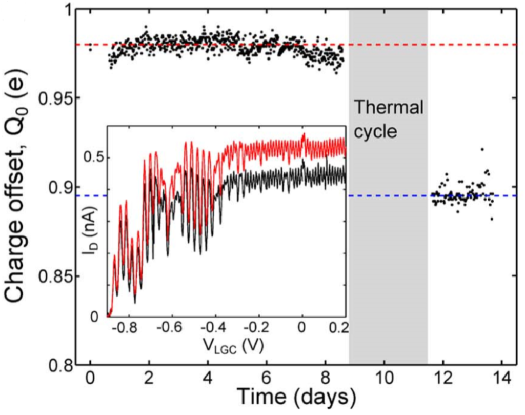 The main panel shows charge offset drift data in an all silicon device with electrostatic barriers. Very stable behavior before and after a thermal cycle to room temperature (represented by the time spanned by the grey bar) is observed. The inset shows the source-drain current as a function of plunger gate voltage before (black curve) and after (red curve) the thermal cycle measured with exactly the same voltages on every gate. All features in the data before the thermal cycle are reproduced in the curve taken after the thermal cycle. The curves are offset for clarity. All data were taken at a temperature of about 2.2 K. Reproduced with permission from reference [46], Copyright 2013, Institute of Electrical and Electronics Engineers.
