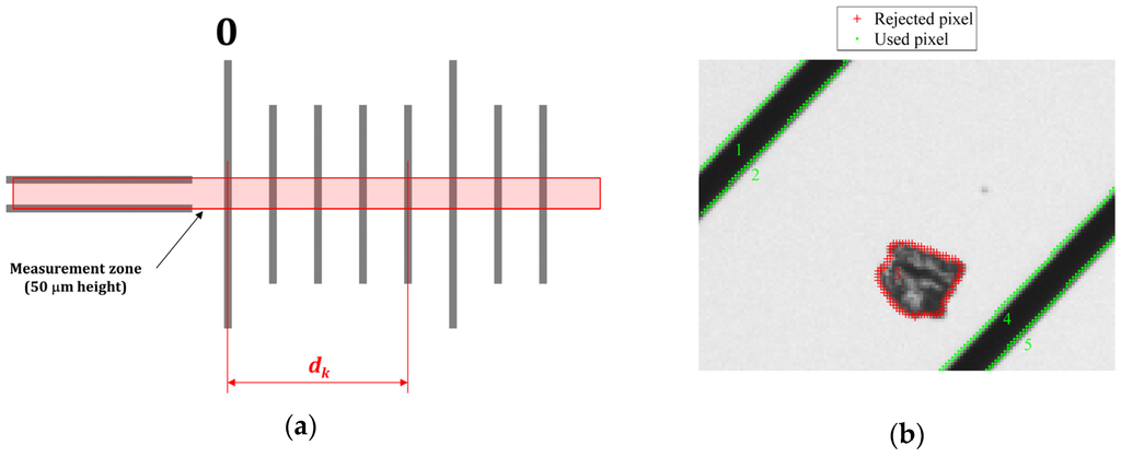 - detection of the pixels that formed the edge of the glass line scale graduations (Figure 2b), employing the Canny edge detection method with “global thresholding”. Each k-th graduation of the glass line scale, with , has two edges, called an odd edge and even, the edges of a k-th graduation are characterized by a several number of points (, ), and, for each of the k graduations, the pixels of the odd edge and the even edge are obtained;