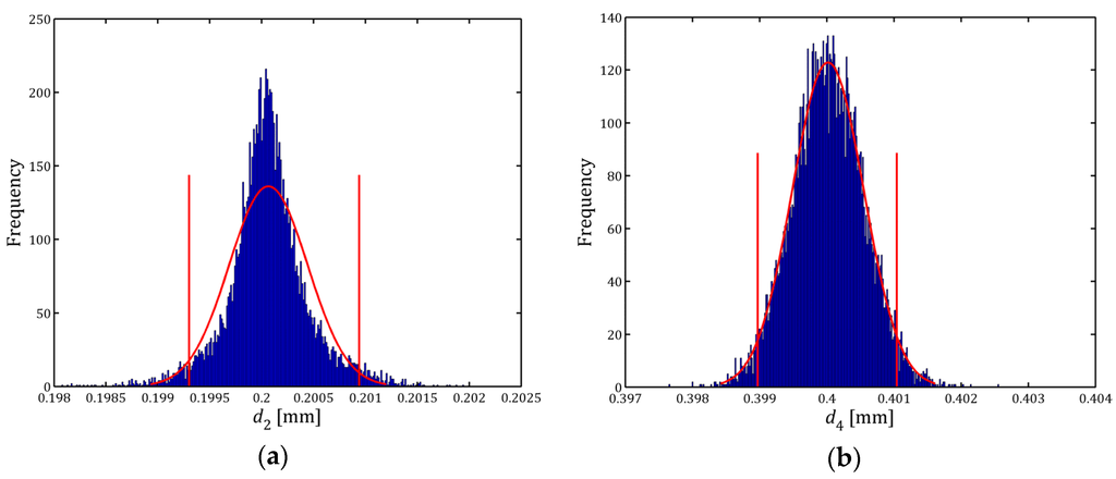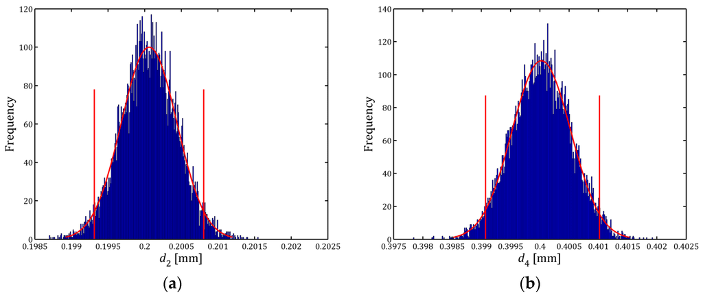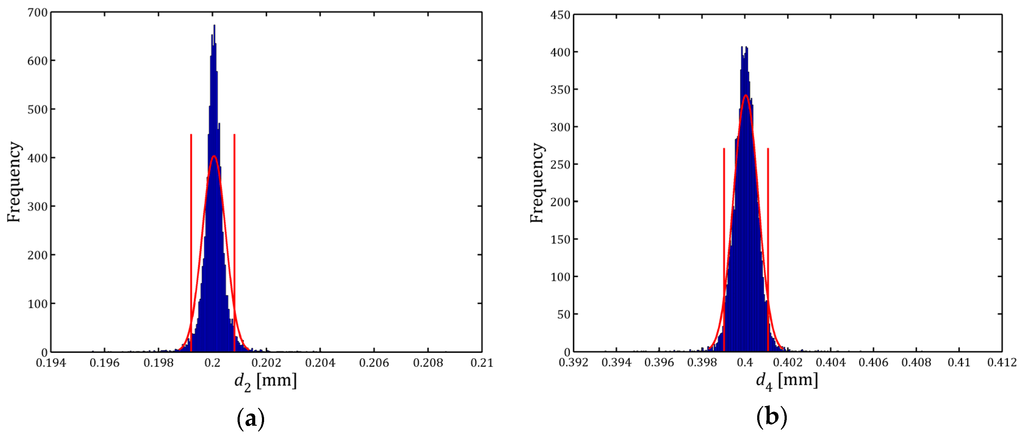 Table 3 shows the results obtained by measuring the glass line scale considering the Hypothesis 1. Figure 3a,b show the histograms of the distances d2 and d4. These results obtained by developing the Hypotheses 2 and 3 are shown in Table 4, Figure 4a,b and Table 5, Figure 5a,b, respectively. Analyzing the results of the above tables, it is observed that variations within a single estimate of the measurand dk obtained in the various hypotheses are between 1 nm and 22 nm, values that can be considered negligible considering that the nominal size pixel in the measurement conditions used was 0.98 μm.