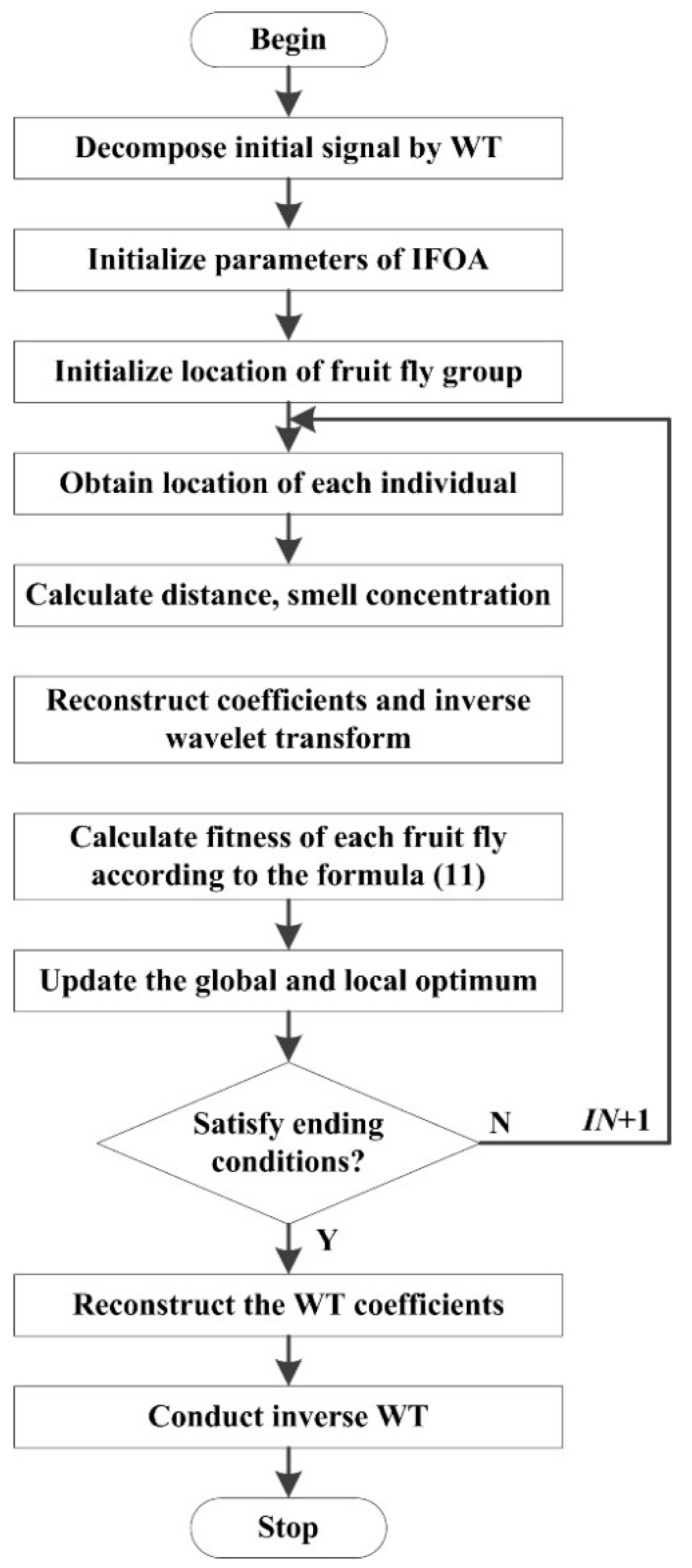 - Denoise the noisy signal by WTD-FOA. The parameters were set as follows: . λmin and λmax were calculated as previously. The fly distance obeys uniform distribution, FR ~ U(−0.2, 0.2). The population number was 5, each group contained 20 individuals and the iteration number was 100. The fitness of each fruit fly was calculated according to Equation (11).