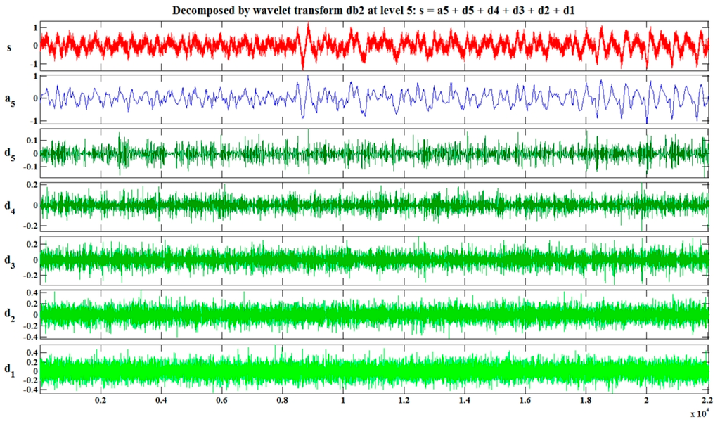 - Add Gaussian white noise into the original sound and conduct wavelet decomposition. A noisy signal with ζ = 5 dB was firstly analyzed and the synthesis was finished in Matlab 8.0 (MathWorks Inc., Natick, MA, USA, 2012). Then the synthetic signal was decomposed by wavelet decomposition with db2 wavelet at 5 levels [6]. The decomposition result is shown in Figure 7.