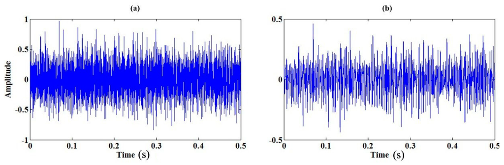 - Denoise the noisy signal by SST. The value range of the wavelet threshold was firstly calculated according to Equation (3). The recommended threshold λrec was adopted according to Donoho, where q = 0.6745. The wavelet coefficients of each level were shrunk according to Equation (5). Then the signal was reconstructed by inverse WT.