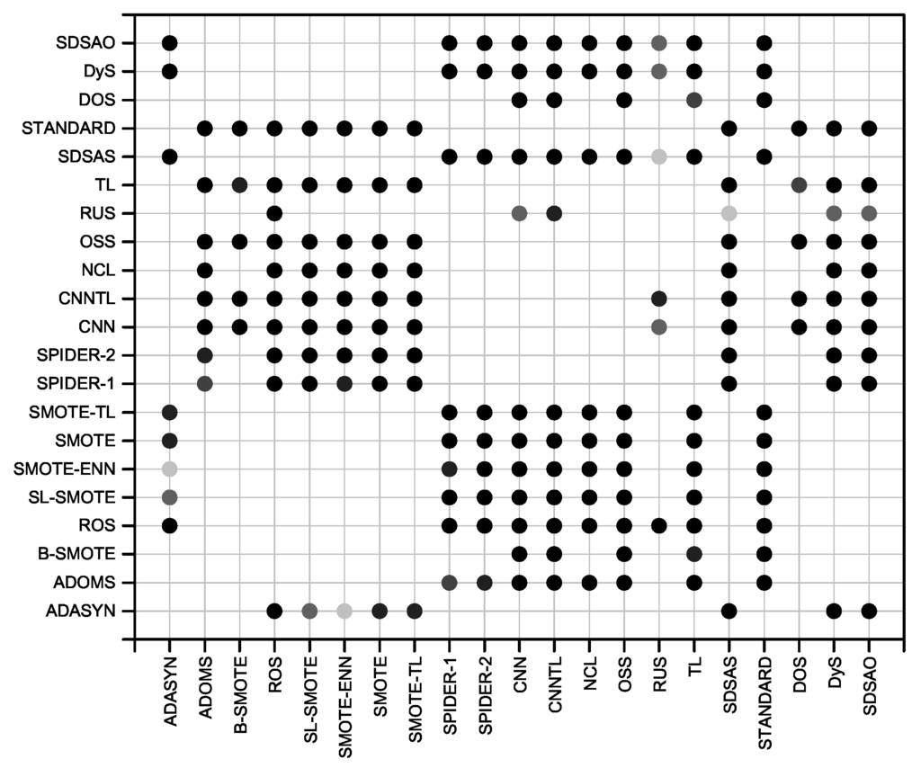 Results of the non-parametric statistical Holm and Shaffer post-hoc test. The fill circles mean that for these particular pairs of classifiers, the null hypothesis was rejected by both test. The color of the circles is the darkest at p-values close to zero, i.e., when the statistical difference is the most significant.