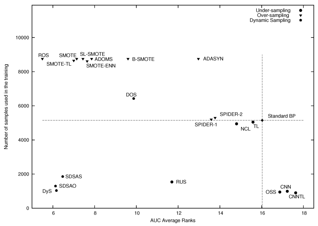 In accordance with Table 2 and Figure 1, most methods of over-sampling present a better classification performance than the standard BP with statistical significance. The under-sampling methods do not present a statistical difference with respect to standard BP performance, and all dynamic sampling approaches improve the standard BP performance with statistical differences.