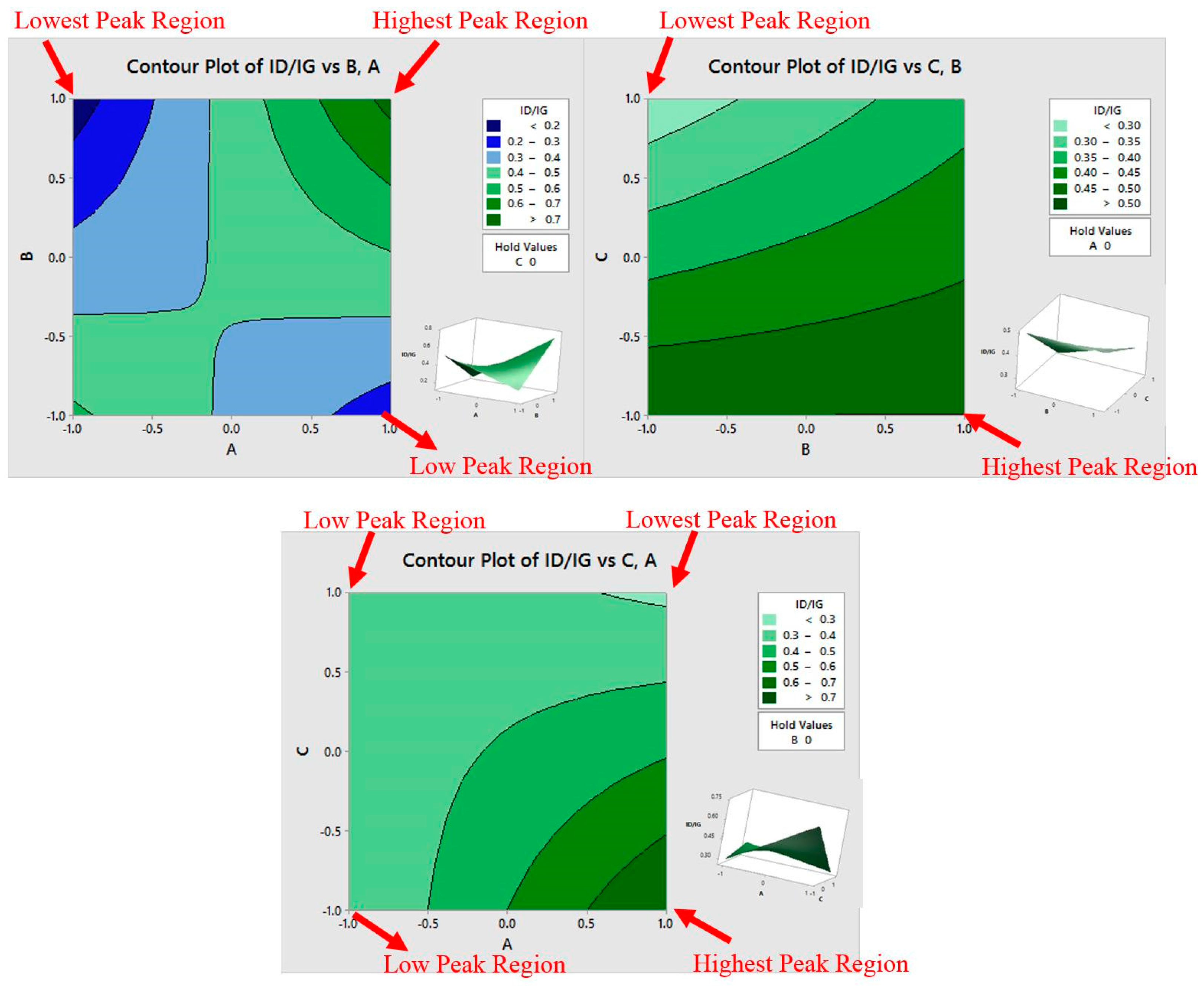 | Annealing Temperature | a-C Layer Thickness | Annealing Time | I2D/IG Peak Intensity Ratio (Response I) | ID/IG Peak Intensity Ratio (Response II) | ||