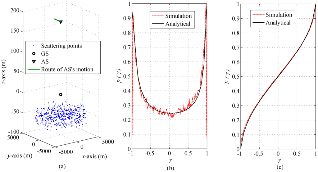 When distance between nodes is increased, and the shadow of AS on the x-y plane is outside the scattering region; the spread in angular data observed at AS decreases to a smaller number from . Therefore, CDFs are approaching one very quickly. The increase in delay span defines an increase in the horizontal dimensions of TESR. This effect of increasing the delays of the longest paths on the Doppler spectrum is demonstrated in Figure 3c. It can be observed that for large values of the delays of the longest paths, the dimension of the TESR is large enough to have the projection of AS on the x-y plane inside the scattering region; therefore, the signals are received from all around, so the CDFs of the Doppler shift are almost symmetric around . The obtained analytical results are also validated through the comparison with the performed simulation results. The computer simulations are performed by adopting the approach presented in detail in [41]. The scatterers are generated in the defined TESR, as shown in Figure 4a. The positions of AS and GS are also shown in Figure 4a. The direction of the motion of AS in the azimuth plane is taken as . The heights of AS and GS are assumed such that AS is close to the ground level. Using the simulation setup, the simulated results for the PDF of the Doppler spectrum are compared to the proposed analytical results shown in Figure 4b, where PDF is U-shaped because the multipath components contributing in the positive and negative Doppler are in equal amounts. The simulated results for the CDF of the Doppler spectrum are compared to the proposed analytical results in Figure 4c. For uniformly distributed scattering points and averaging over 2000 Monte Carlo runs, a good match is observed between simulation and analytical results.