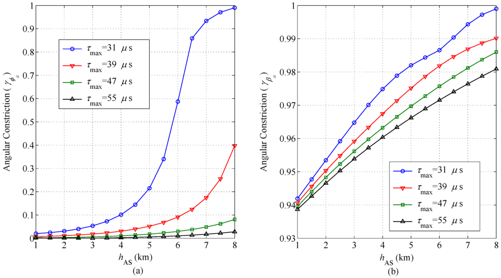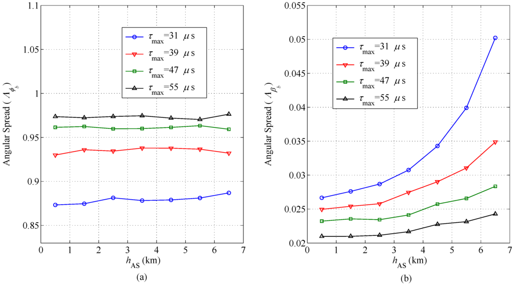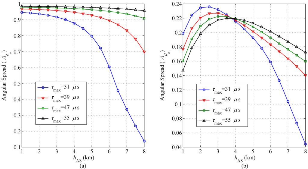 A thorough analysis on the results of the SFs for the A2G/G2A communication channel is presented. The SF angular spread gives the measurement of the concentration of multipaths around a single direction by using the range zero to one. The azimuthal and elevational angular spread observed from AS with respect to the height of AS for different delays of the longest propagation path is shown in Figure 5a,b, respectively. The azimuthal angular spread decreases with an increase in the height of AS. However, the rate of decrease increases rapidly with respect to the increase in the height of AS by reducing the . The elevational angular spread observed from AS increases gradually with the increase in height of AS up to the height when the projection of AS on the x-y plane lies within the scattering region, and it decreases with the further increase in the height of AS. Moreover, the elevational angular spread shows a converse trend with respect to . The elevational angular spread with an increase in decreases up to a certain height of AS: whereas, with the further increase in the height of AS, it increases.
