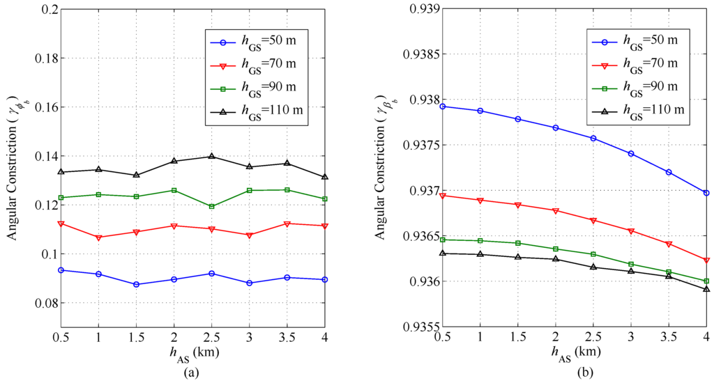 The angular constriction w.r.t. the azimuth angles increases with the increase in the height of AS; however, the rate of increase decreases with the increase in . The angular constriction w.r.t. the elevation angles gradually increases with the increase in the height of AS. Moreover, with the increase in , it decreases. The azimuthal and elevational angular spread observed from GS with respect to the height of AS for different values of is shown in Figure 7a,b, respectively. The azimuthal angular spread is observed to be constant (approximately) with respect to the increase in height of AS; however, it increases with the increase in . An exponential increase is observed in the angular spread in the elevation plane seen at GS with the increase in the height of AS. Furthermore, the rate of the increase in the angular spread decreases with the increase in . The angular constriction for the azimuth and elevation angles for different values of the height of GS observed from GS with respect to the height of AS is plotted in Figure 8a,b, respectively. The angular constriction remains almost constant with respect to the azimuth angles with the increase in the height of AS as long as AS lies inside the scattering region; however, it increases with the increase in . The angular constriction with the elevation angles has a gradual decrease with the increase in the height of AS. However, conversely with the azimuthal side, it decreases with the increase in .