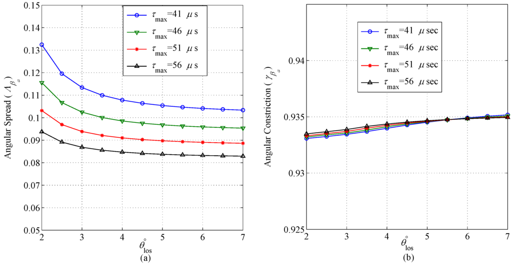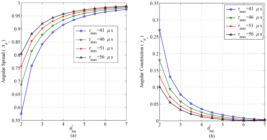 The behaviour of the elevational angular spread and the angular constriction against the elevation LoS angle observed at the AS side of the link: (a) angular spread in azimuth plane; (b) angular constriction in elevation plane ( = 400 m, = 50 m and = 30 m).