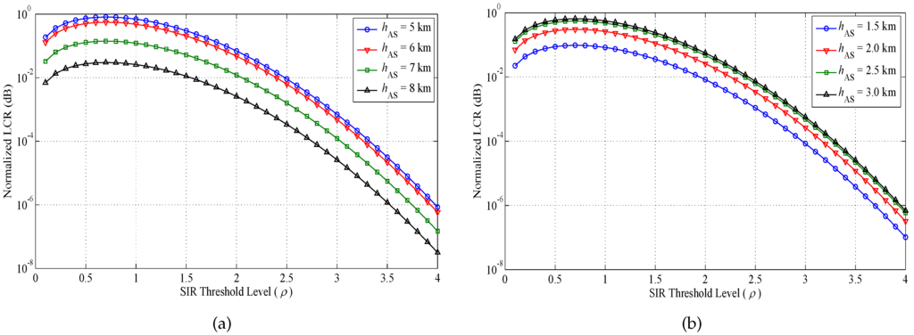 Level crossing rate: (a) observed from AS ( = 7000 m, = 30 m, d = 3 km and = 20 m); (b) observed from GS = 4500 m, = 120 m, d = 5 km and = 35 m).